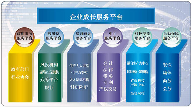 为全面扶持创业项目和企业的发展,公司建设了包括政府事务、投融资、培训辅导、中介服务、科技交流、后勤保障等服务平台的孵化服务体系,从政策、人才、资金、市场、经营、管理等方面提供低成本、便利化、全要素、开放式的一站式孵化服务,帮助企业实现创业、创新、发展的梦想。
